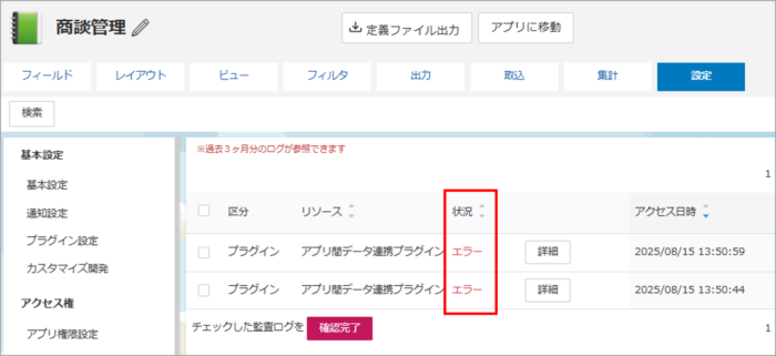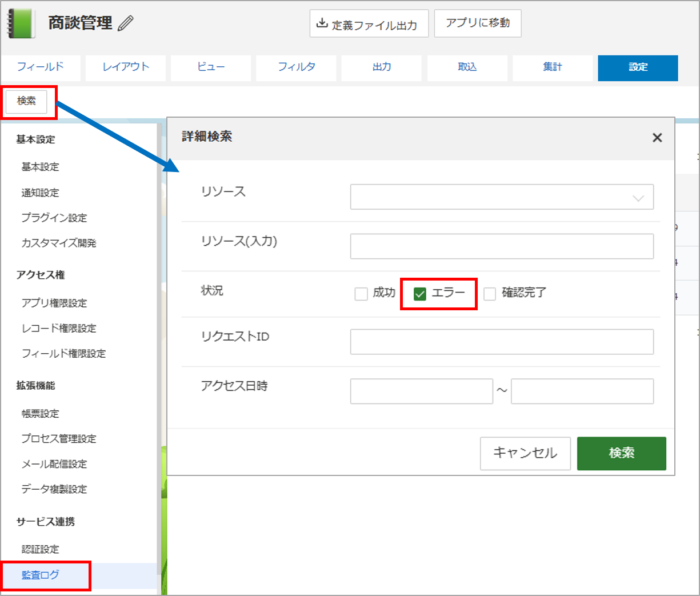 アプリ管理>アプリ名>設定>サービス連携>監査ログ