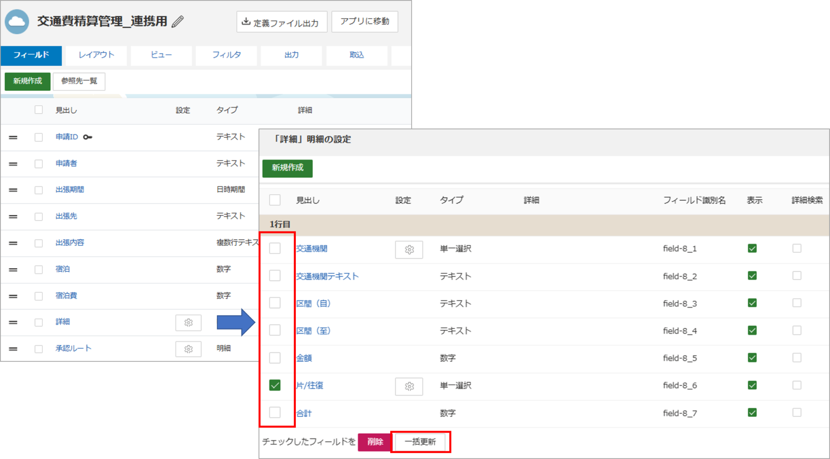 アプリ管理>アプリ名>フィールド>該当フィールドの明細設定