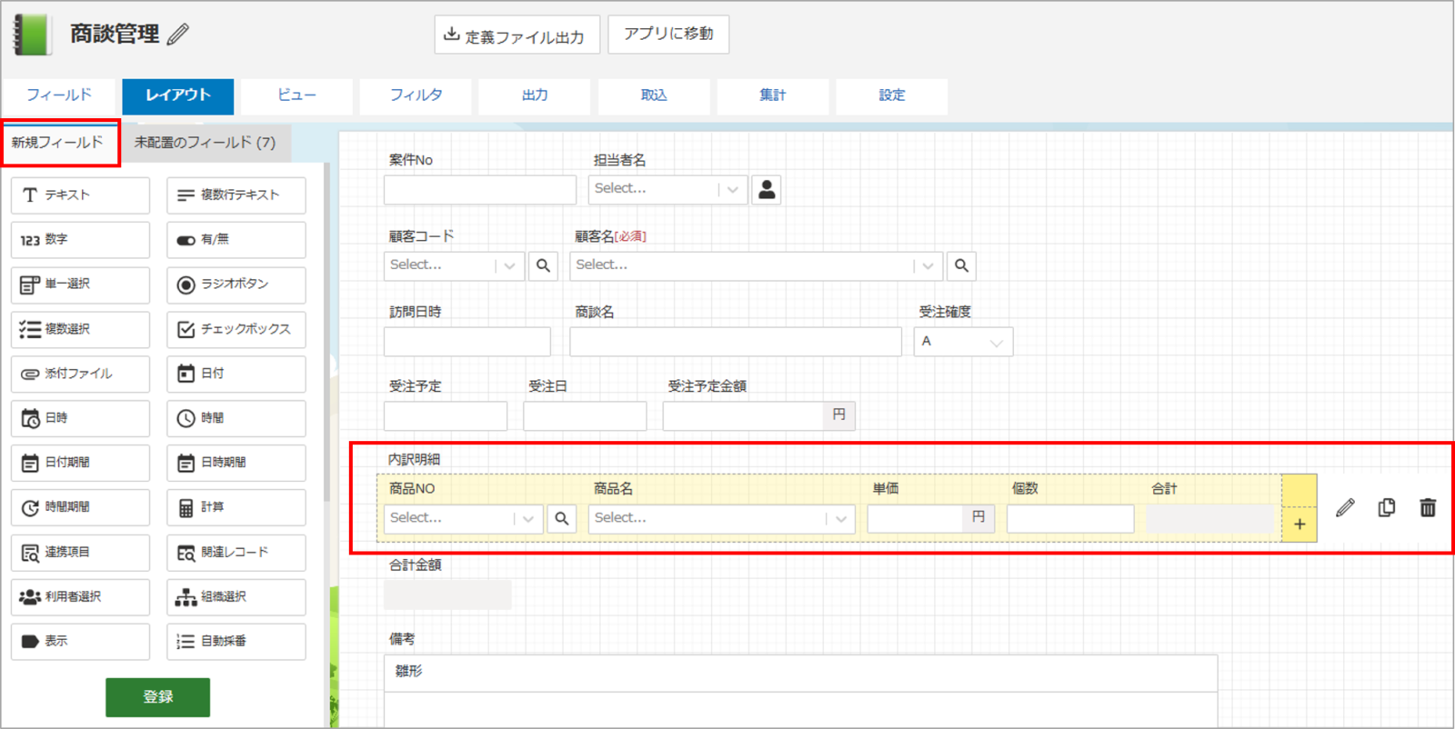 そのため「新規フィールド」からタイプを配置する必要があります。