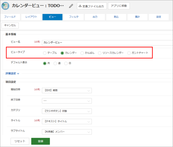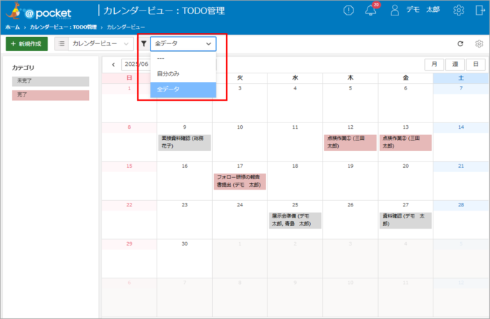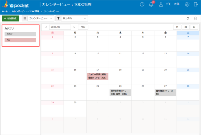 カテゴリ(赤枠箇所)にTODO管理の「状態」フィールドを指定することで、カテゴリごとの登録状況が月間カレンダー形式で表示されます。