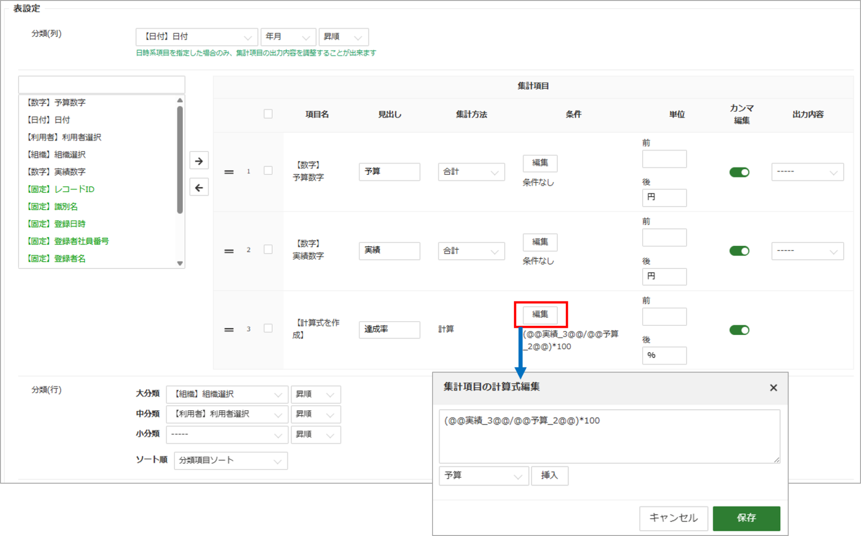 集計項目:「予実数字」「実績数字」「【計算式を作成】」を追加