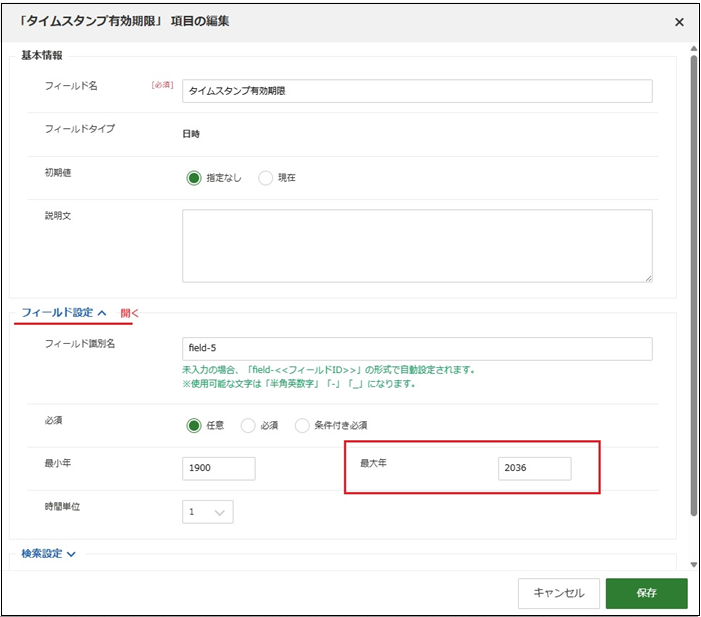 日付フィールドの最大年はデフォルトで「2036年」のため、2037年以上の日付がセットできず