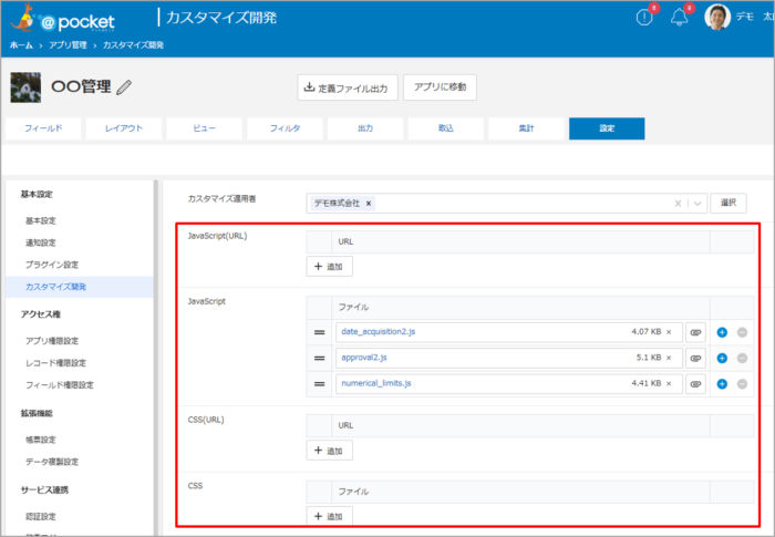 ※10/19深夜に行われる定期アップデート以降利用できる機能となります。 ※プロフェッショナルプランで利用可能です。 カスタマイズ開発のURL、ファイルの上限が10に増えます。 [設定方法] アプリ管理>アプリ名>設定>カスタマイズ開発