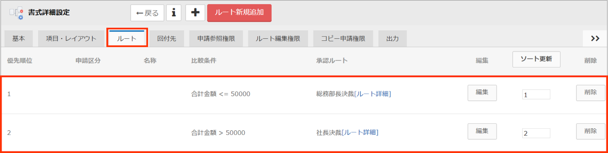 該当書式のルート設定にて、条件分岐でルートを設定している場合