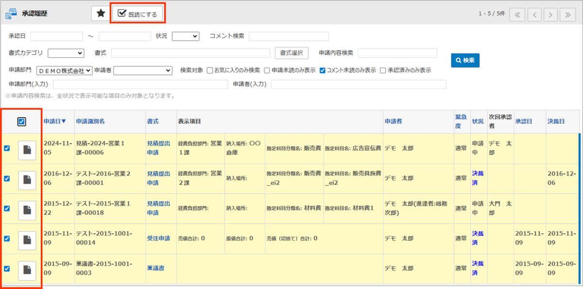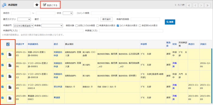 共有コメントを既読にしたい申請にチェックし、「既読にする」ボタンをクリックすることで、一括既読が可能です。