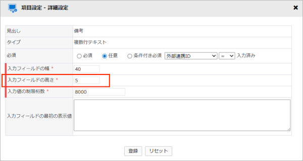 複数行テキストの高さの指定は、該当項目の詳細設定から行います。