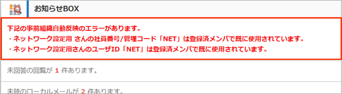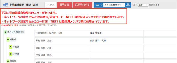 事前組織反映時のエラー内容は、管理者事前組織の権限を持っているメンバにのみ表示されます。